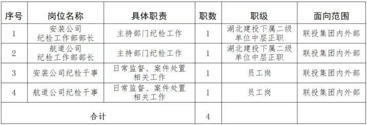 本次公开竞聘共4个岗位,面向湖北联投内、外部同时开展,合乎条件的人员均可报名参加